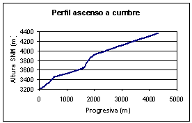 ante un extenso nevé. Era bastante profundo (en algunos lugares uno se podía hundir hasta la cintura) pero con una senda bien marcada. Nos pusimos las polainas y continuamos. Adrián cruzó primero y se dedicó a filmar el paso del resto. Bastante cansados, arrastrando los pies y sufriendo los embates de un viento bastante fuerte, los últimos alcanzamos la cumbre a las 13:37 hs. El GPS marcaba 4371 metros. El altímetro solo funcionó hasta los 4000.