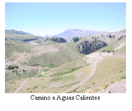A la mañana siguiente, entre las averiguaciones en turismo y la compra de víveres terminamos saliendo a las 9:50 rumbo a Varvarco. El primer tramo de 43 km hasta La Primavera de pavimento, luego el ripio que no nos volvería a abandonar hasta bastante más lejos. Antes de llegar a Andacollo nos desviamos hacia la localidad de Huinganco, un lugar que nos hizo recordar a La Cumbrecita en Córdoba, ideal para pasar unas vacaciones de puro descanso. Pasando Andacollo, nos detuvimos en un punto panorámico con vistas espectaculares del río Neuquén y de la Cordillera del Viento. Pasamos por Las Ovejas, donde se estaban preparando para las festividades de San Sebastián (nos llamaron la atención los excelentes baños públicos) y continuamos hasta Varvarco (1235 msnm). Según nuestros datos era la última población rumbo al norte, más allá solo estaba Aguas Calientes que teníamos indicado como centro termal. En Varvarco hay un camping municipal y 4 cabañas. Quiso nuestra buena fortuna que una estuviese disponible y allí nos quedamos. Eran las 14:00. Comimos rápidamente algo y dejando el batan seguimos hacia Aguas Calientes. Un camino muy lindo, cruzando el arroyo Covunco que forma un cañón espectacular. Llegamos a Aguas Calientes a las 16:00. Un par de cabañas y un “centro termal”. Solo para los que les interesen los baños termales o el paisaje, no hay ni una proveeduría.