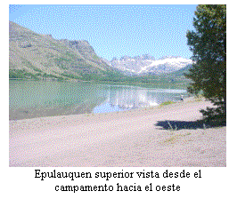 Merendamos y salimos para llegar a Varvarco y al fin del día. La cuesta a subimos sin problemas con la 4WD low pasando a una potente Ssanyong que no se atrevía a bajar. Llegamos a la cabaña a las 19:30 habiendo recorrido un total de 212 km en el día. A la mañana siguiente dejamos la cabaña y después de visitar la confluencia de los ríos Varvarco y Neuquén (notable por la diferencia de las aguas) emprendimos el camino hacia el lago Epulauquen (situado al oeste de Las Ovejas, junto al límite internacional. A las 12:30, luego de hacer escala en Las Ovejas para