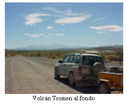 A las 12:45 paramos en el cruce del desierto donde almorzamos rápidamente y fuimos a cargar combustible al ACA de 25 de Mayo. Allí nos despedimos de los Beitia que se quedaron a almorzar junto al río para luego seguir a Bariloche. A eso de las 13:45 llegamos a Catriel y allí nos despedimos del pavimento. Cruzaríamos directo a Chos Malal por las rutas provinciales 16 (La Pampa) y 6 (Neuquen); teníamos por delante dos tramos de unos 100 km de ripio cada uno, la oportunidad de probar la “defensa” colocada en la camioneta para evitar que las piedras golpearan al batan (y lo dejaran sin pintura como el año pasado). El primer tramo de ripio estaba bastante movido. Cruzamos el límite entre las provincias de La Pampa y Neuquén sin darnos cuenta (ni un mísero cartel). Alcanzamos el pavimento y por él nos dirigimos a Rincón de los Sauces, localidad petrolera situada a orillas del río Colorado. Llegamos a las 16:15 y nos detuvimos unos minutos para estirar las piernas en una calle lateral, a la sombra de los álamos. Para retomar la ruta tuvimos que subir un empinado terraplén con ripio suelto: 4WD con baja y salimos sin el más mínimo resbalón. Terminado el pavimento continuamos por un ripio en mejor estado que el anterior. Unos kilómetros más allá y se comenzó a perfilar la cordillera: el volcán Tromen en primer plano.